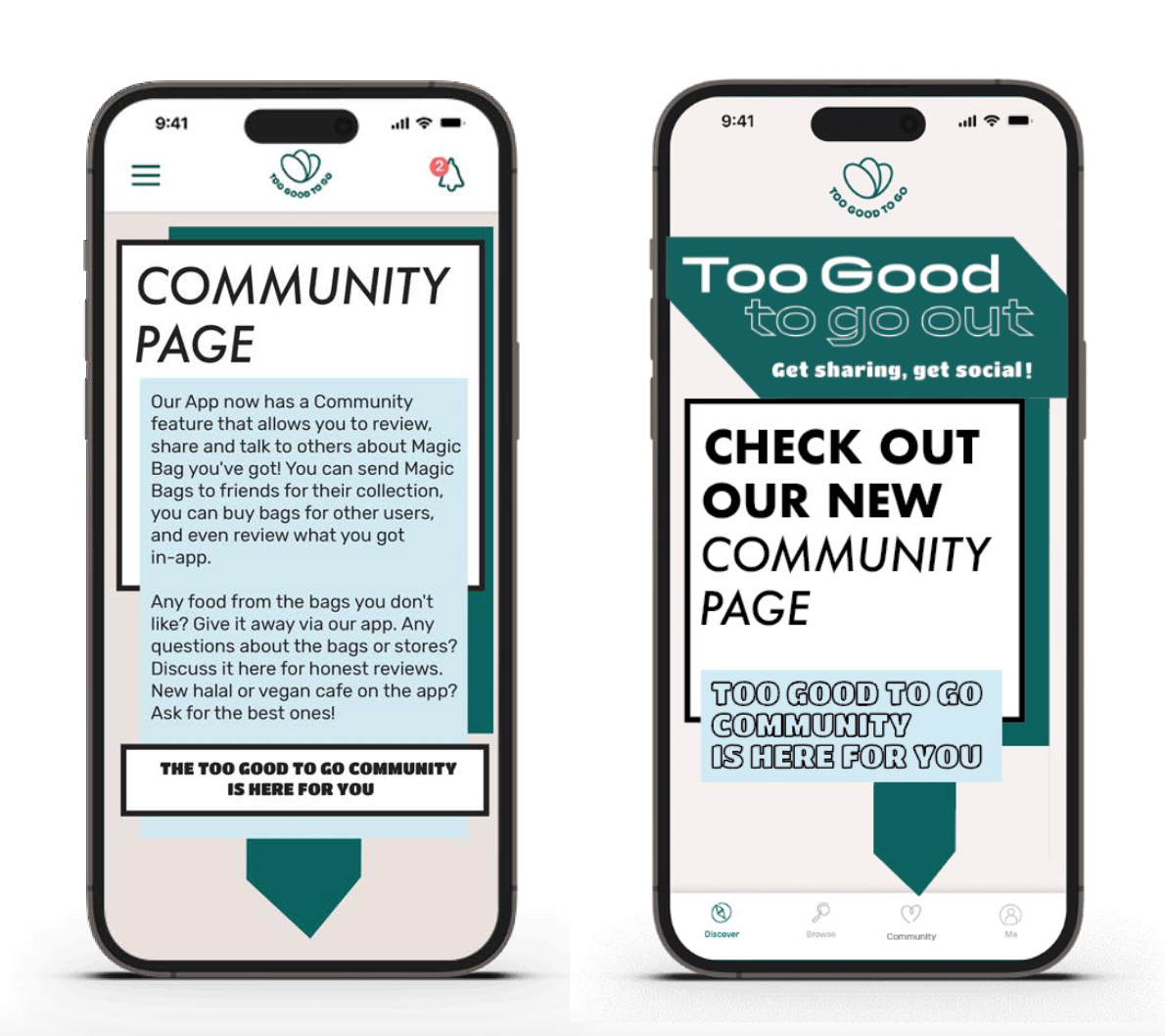 Introducing the "Community Tab" – a vital element of our campaign recognizing the significance of community and social lives for Gen Z, our target audience. This innovative app feature allows users to engage directly, sharing, suggesting, and reviewing Too Good To Go's Magic Bags, fostering a sense of community and enhancing app usage. Users can also split bag costs, share bags via a direct in-app link, and discuss dietary preferences, addressing concerns and building a more inclusive community. The Community Tab, a key component of our rebranding, will be promoted across social media platforms, revolutionising how users connect, contribute, and make a positive impact.
